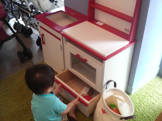 でもプレイスペースにおままごとキッチンとカラフルなつみきが見えて